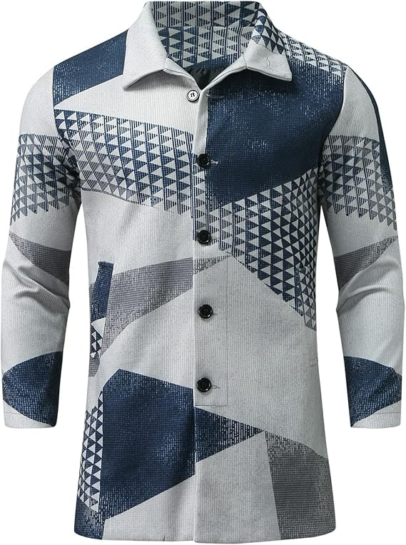 This men's coat features a printed design with a button front and long sleeves. Designed with a straight cut, it creates a defined silhouette with functional pockets. The coat combines classic and contemporary elements for adaptable outerwear.